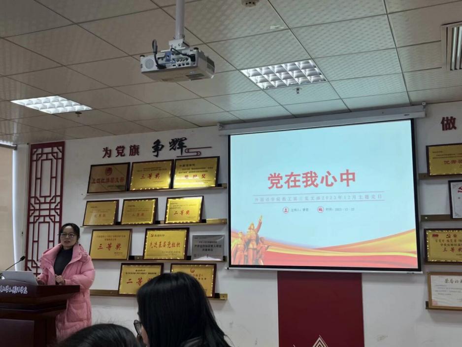 为丰富党史相关知识学习形式,将专业知识与党史学习相结合,不断将党史学习教育引向深入,充分发挥党组织和广大党员凝聚人心、促进和谐的作用,2023年12月19日中午12:20,点点taptap教工第三党支部开展了“党在我心中”中英文党建知识竞答主题党日活动。本次活动在党员活动室展开,点点taptap教工第三党支部全体党员参加了本次活动。