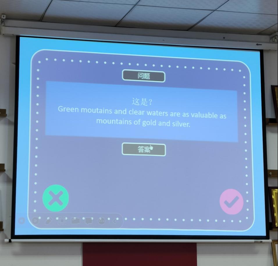 本次竞赛以党史知识竞答的形式带领大家回顾和重温了中国共产党的光辉历史,每位党员均参与答题。竞答内容除党史相关知识外,还涵盖了时事热点和传统文化的翻译,如“绿水青山就是金山银山——Green mountains and clear waters are as valuable as mountains of gold and silver” “人类命运共同体—— A Community with a Shared Future for Mankind” “高质量发展——High-quality Development”“《山海经》——The Classic of Mountains and Rivers”等。比赛过程中党员教师们积极踊跃答题,现场气氛热烈,展现出了扎实的党史知识功底。