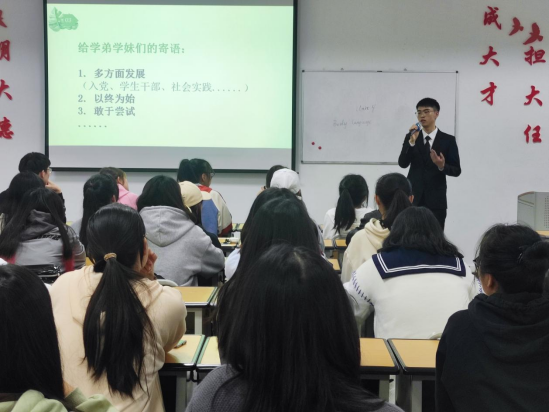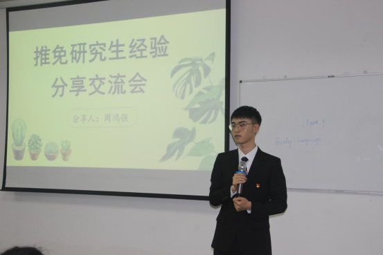 周鸿强主要从推免生遴选条件细则、如何获得推免名额、推免流程三个方面进行讲解。他介绍了推免生遴选条件细则中的必要条件和加分要求、保研流程,鼓励同学们培养学术研究兴趣,保持良好的学习态度。他分享了大学四年的收获与推免面试部分的一些经验,提醒同学们在面试过程中保持自信和良好的心态,勉励同学们刻苦学习、厚积薄发。答疑互动环节,现场同学们积极踊跃地提出问题,周鸿强对同学们提出的问题一一解答并提出实质性的建议。同时,也向所有同学们送上寄语,鼓励大家在提升专业成绩的同时,要格外注重培养个人的竞赛经历,尝试多方面发展,多向老师、学长学姐们进行请教。