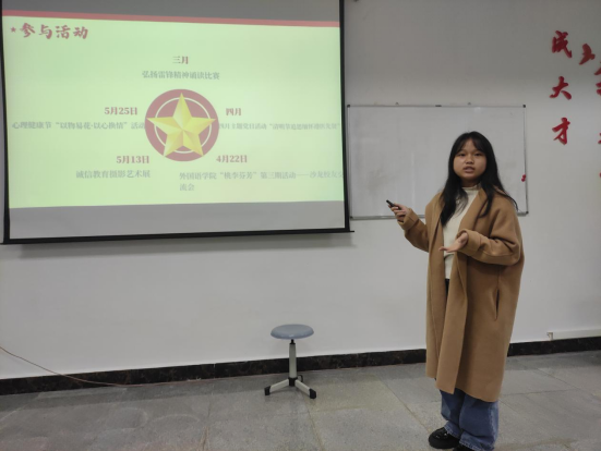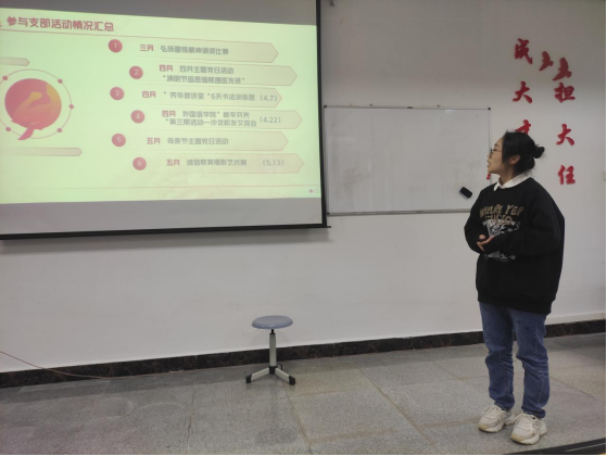 入党积极分子的考察汇报由支委会、普通党员联合给分,采用自评、他评相结合。入党积极分子围绕思想汇报、“学习强国”学习、支部贡献度、社会实践与公益服务、员工干部履职、学业成绩等方面进行汇报。汇报结束,杨芳针对ppt制作、汇报技巧进行了点评,还叮嘱了后半年考察的注意事项。