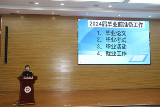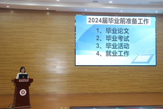 杨芳详细介绍了毕业涉及的相关事项,从毕业前夕要审核完善的信息、论文撰写、论文答辩、毕业相关材料领取及档案转接等若干问题逐步介绍,还详细介绍了就业材料收集。最后,唐茜从简历制作、面试技巧到岗位申请等方面对2024届毕业生作了详细指导,并对就业工作提出了要求,同时,对2021级的实习给予了专业的指导和建议。