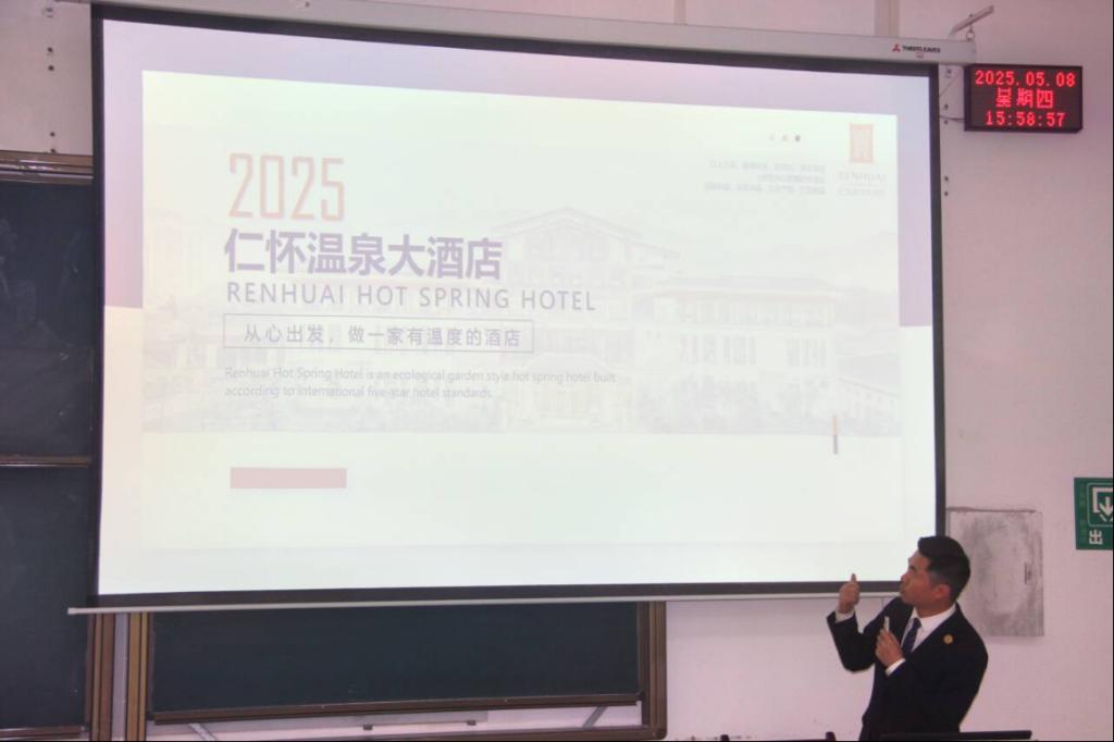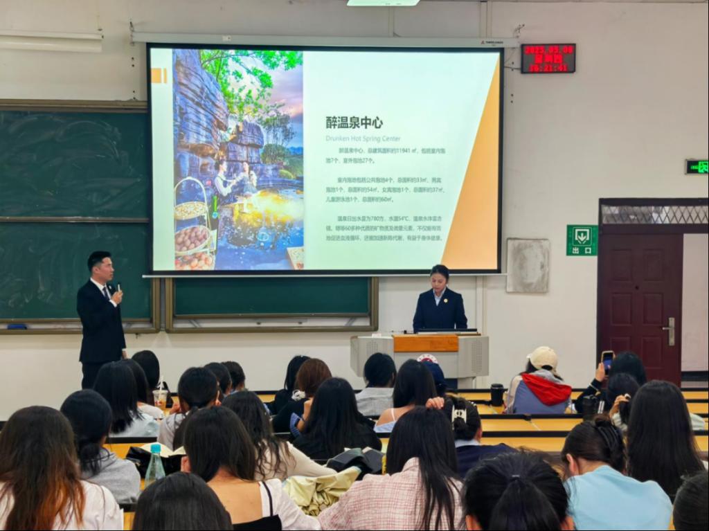 为深化校企合作,搭建员工实习与就业平台,高质量开展就业工作。2025年5月8日15: 50,点点taptap邀请仁怀温泉大酒店相关负责人在第二教学楼第三阶梯教室开展招聘宣讲活动,本次活动由公司党委副书记唐茜主持,仁怀温泉大酒店办公室主任王晶晶、人事经理张悦悦主讲,酒店招聘主管张林、公司团委负责人郑婉萍、2021级和2022级共120余人参加。