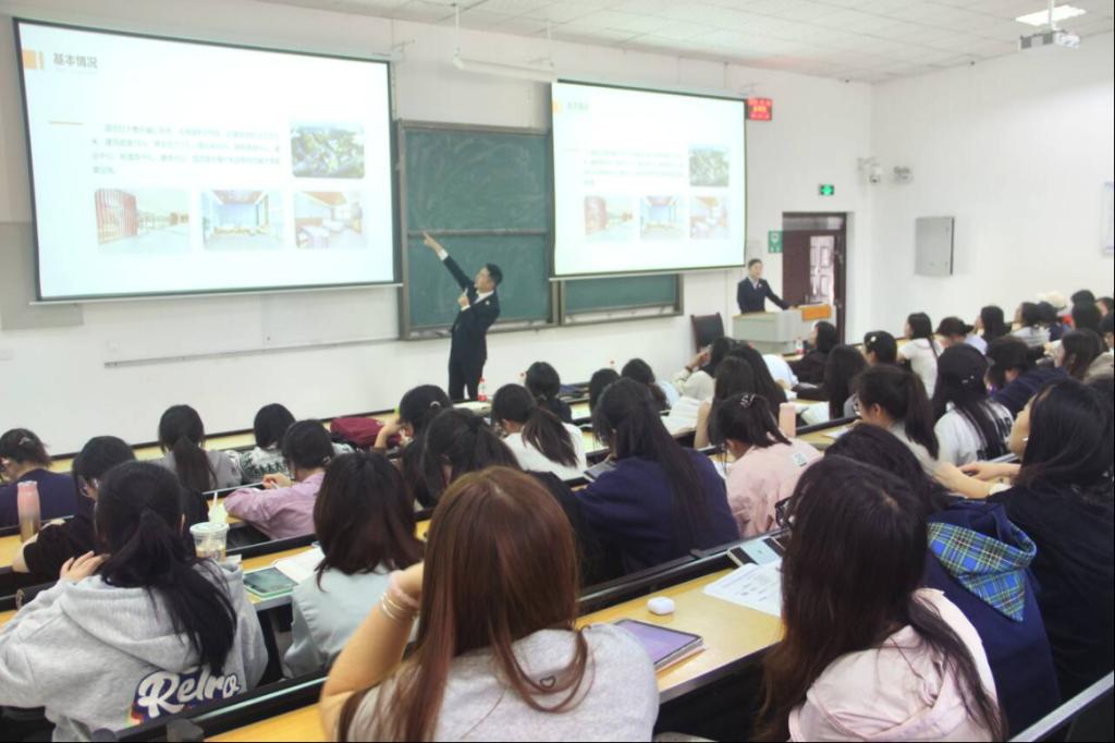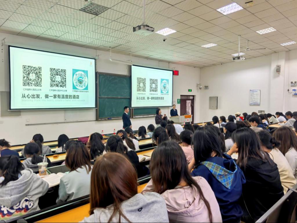 王晶晶通过宣传短片、PPT展示和现场讲解,从五个方面向同学们系统介绍了酒店基本情况、酒店团队建设、酒店各类活动回顾、酒店创新服务业态、岗位需求及福利待遇。张悦悦对酒店情况和岗位需求进行了补充说明。酒店相关负责人现场解答了同学们对职业发展、岗位要求的疑问,与同学们进行了深入的交流,表达了对大家加入的期待。唐茜给同学们分享介绍了4月去酒店实地参观走访的情况,并鼓励同学们打开就业思路,对有意向的岗位积极投递简历。宣讲结束后,部分同学对相关岗位表现出了浓厚的兴趣,张悦悦与有意向的同学进行了现场面试。